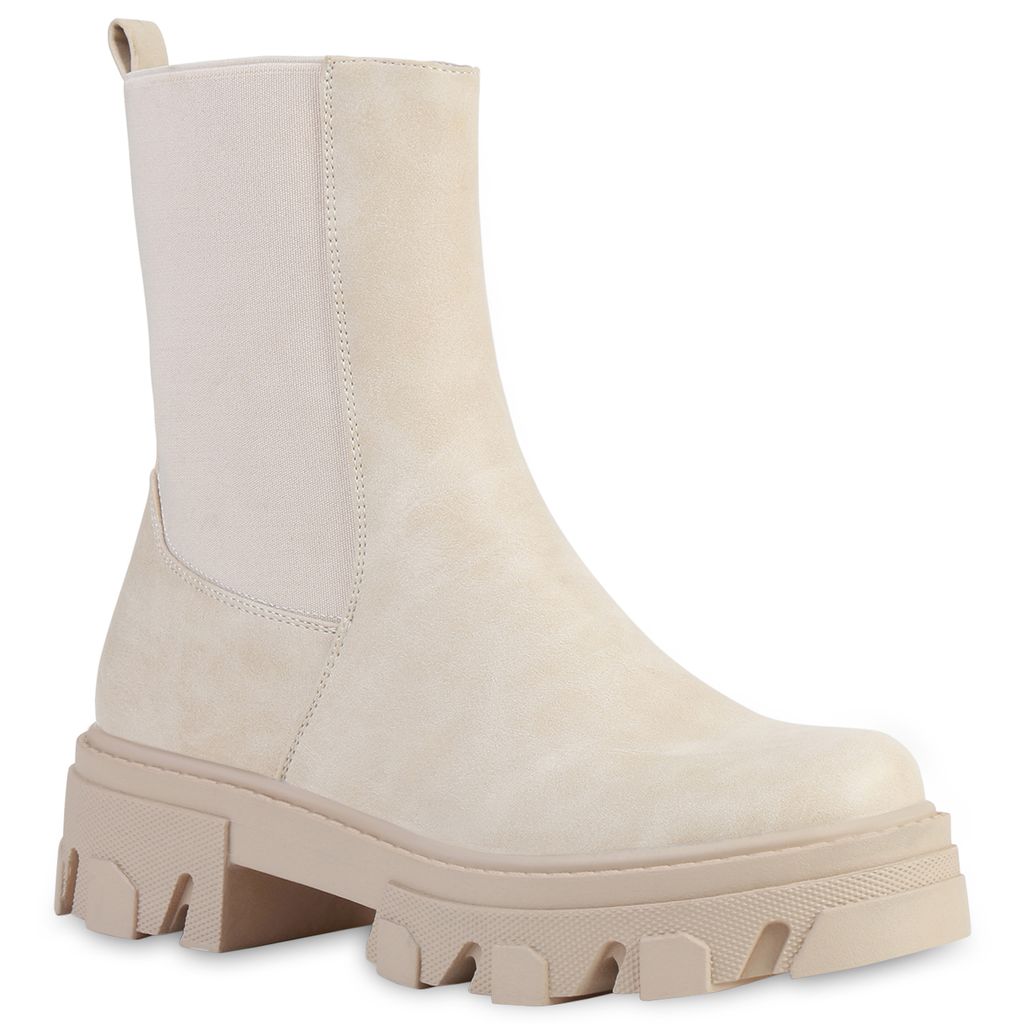 VAN HILL Damen Stiefeletten Plateau Boots Stiefel Profil Sohle Schuhe 835598, Farbe: Creme, Größe: 38